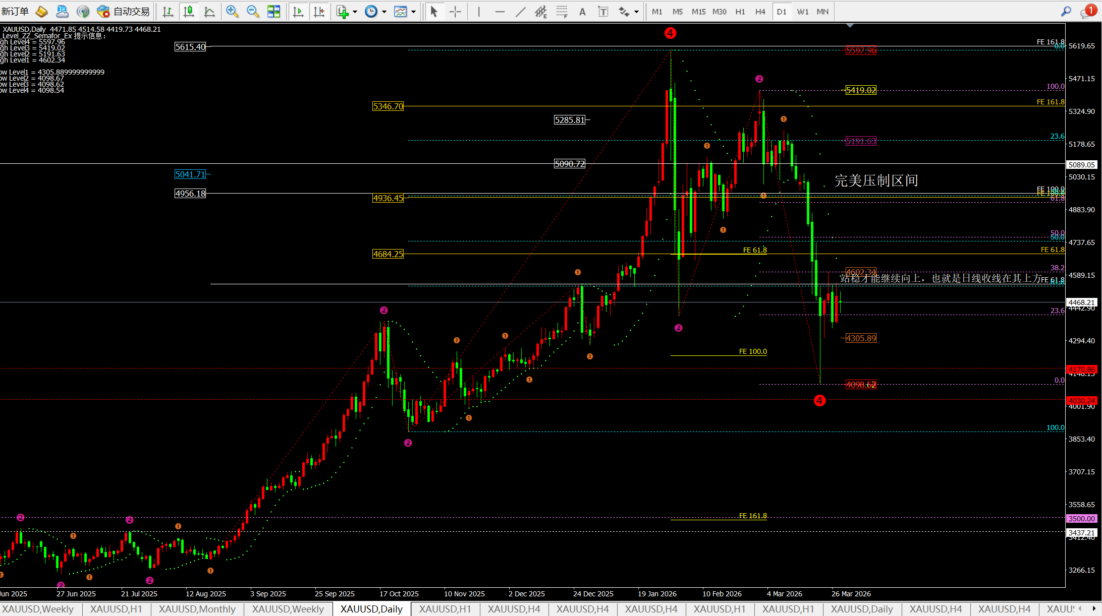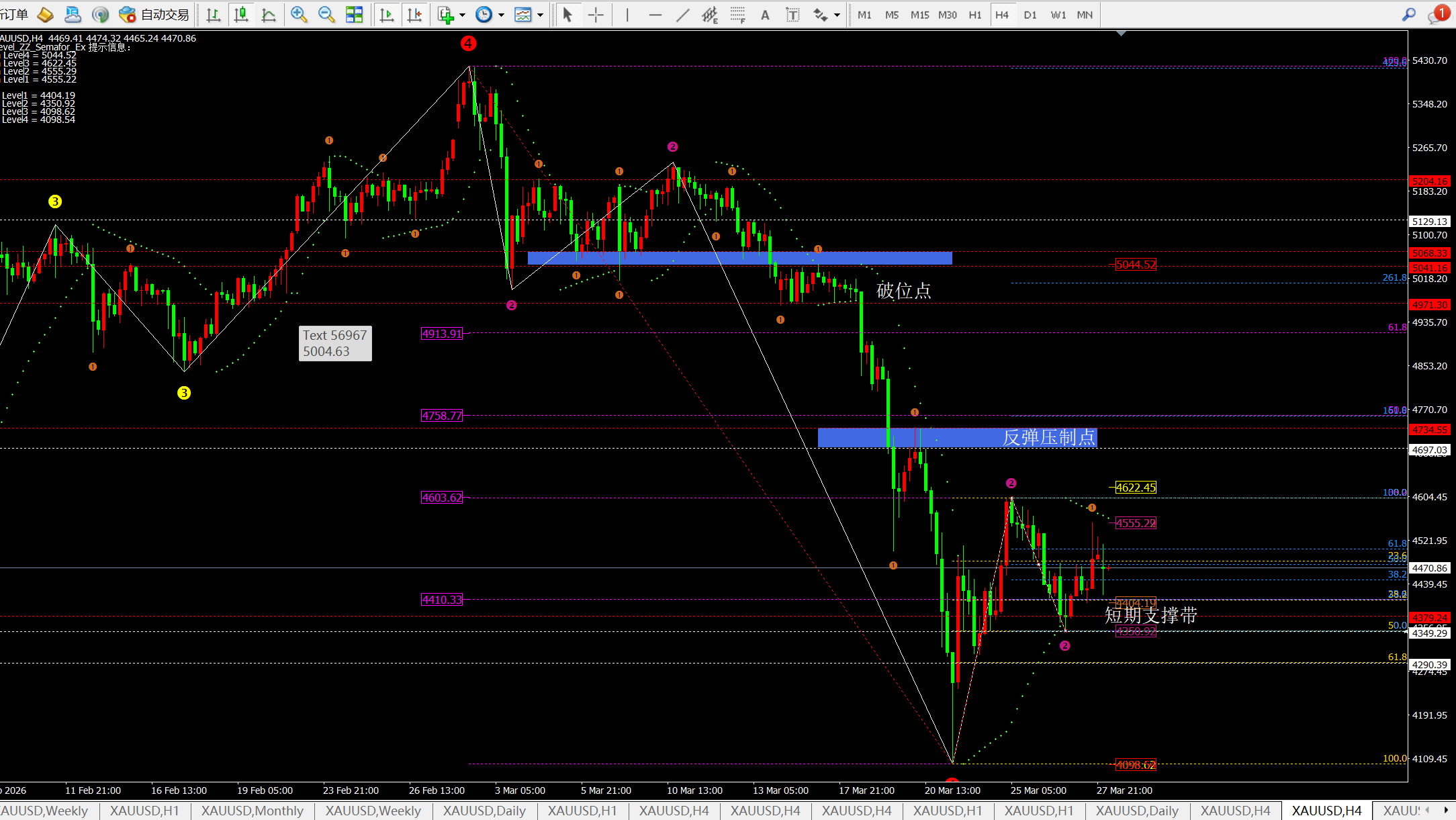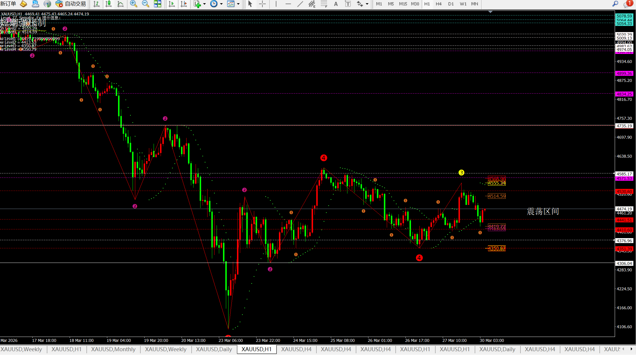 理;而震动区间就是4小时的上下轨对应4358-4600一